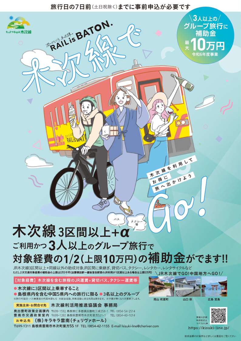 「 木次線でGo ! 」JR運賃等半額助成の対象期間について、令和8年2月末までの移動に延長しました。本事業を利用して、お得な木次線の旅へお出かけください。