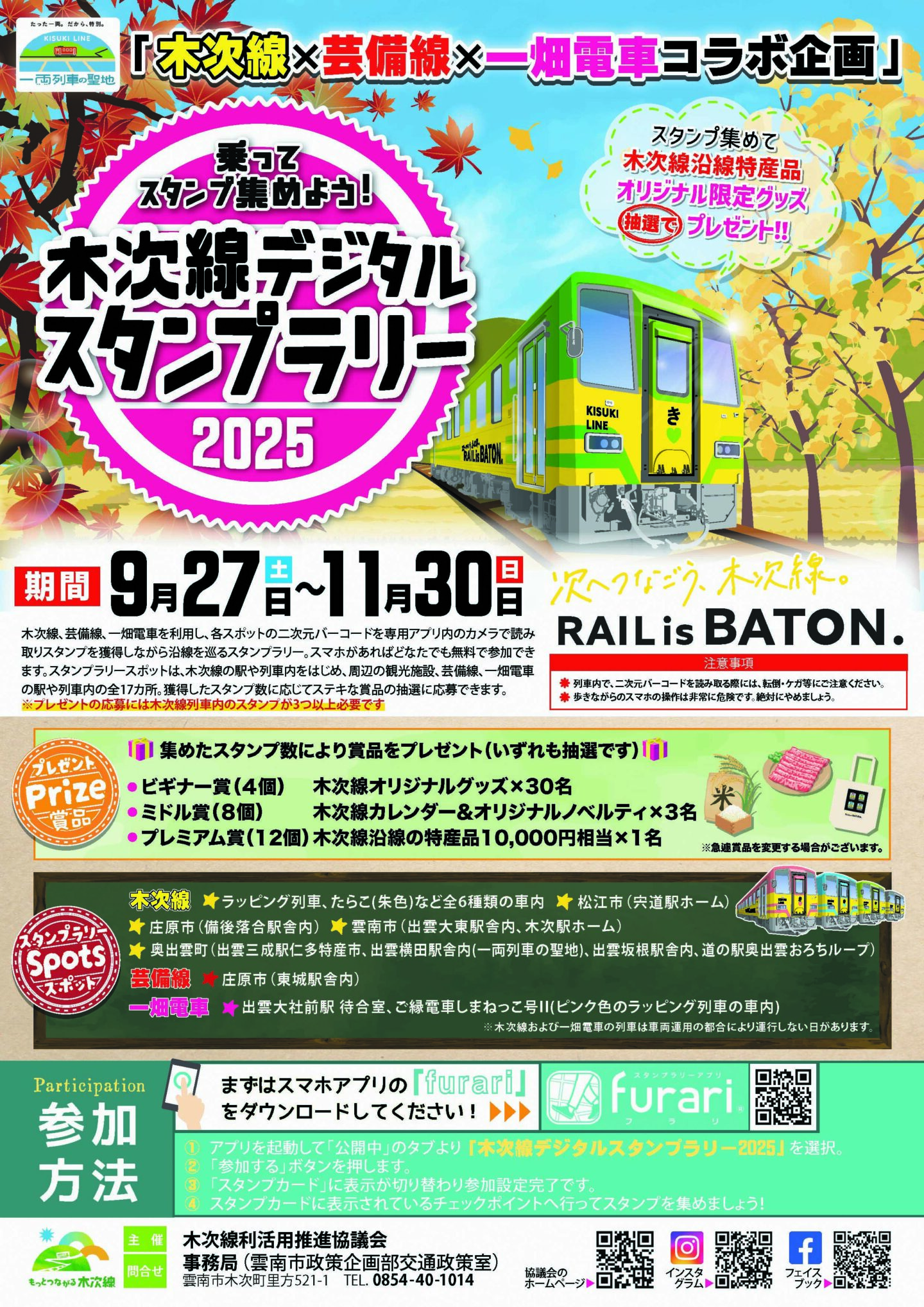 木次線デジタルスタンプラリーチラシ 昨年に続き今年も木次線デジタルスタンプラリーを開催します! 開催期間は9月27日(土)~11月30日(日)までの約2ヵ月です。 今年は、同じローカル線として […]